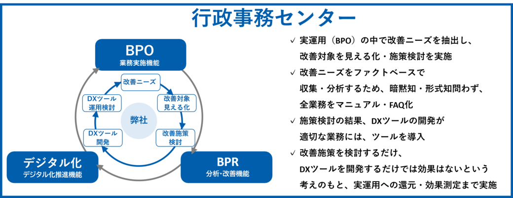 - DXツールとBPOの連携による全体最適化 AI-OCRやRPAなどのDXツールを単独で導入するだけでなく、実運用での効果測定まで含めて、業務全体を最適化する仕組みを提供します。世田谷区では、総務事務のオフサイトセンター化により、運用スキームの変更や申請の電子化などを推進しています 。