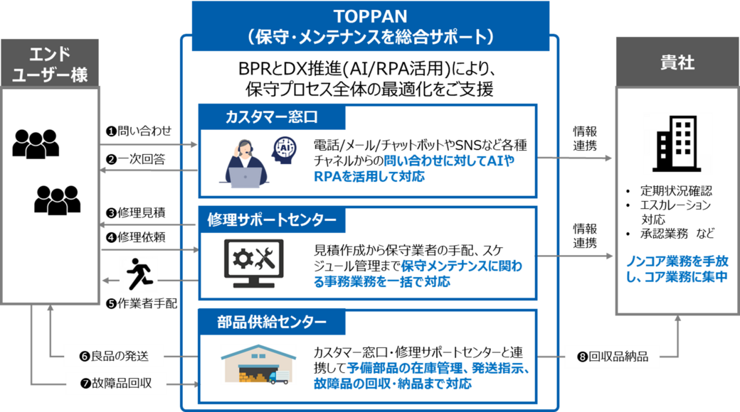 問い合わせ受付から修理業者の手配、部品の発送・回収まで、TOPPANが窓口となり一気通貫で対応します。