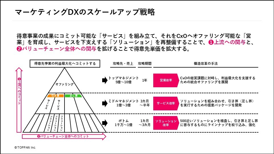 秋月:その最たるものが、経営層(CXO)に対する「オファリング」です。これは、「お客様の課題に対して仮説を持って商談に臨む」という考え方の最上位概念であり、我々のチャレンジすべき領域です。目指しているのは、先ほど申し上げた「引き算」と「足し算」によってお客様の利益に貢献することを約束する「需要創造型のセールス」です。この実現のために、営業組織の役割分担を見直しました。元々TOPPANは、フロントに立つアカウント営業が単一の印刷事業を売るというシンプルな構図でした。しかし現在では事業が多岐にわたり、一人のアカウント営業が全ての商材を深く理解して売るのは非常に困難です。特に、我々のいるマーケティングDX領域はテクノロジーの進化が速く、専門性が求められます。