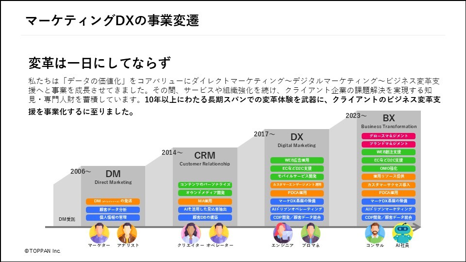 秋月:我々はこの領域で、お客様の個人情報をお預かりするビジネスからスタートし、CRMのデジタル化支援、DXブームの中でのデータ基盤構築支援などを経て、現在ではコンサルティングやAI活用といったビジネス変革のご支援まで、事業を変革させてきました。この我々自身の変革のメソッドをお客様に提供しています。