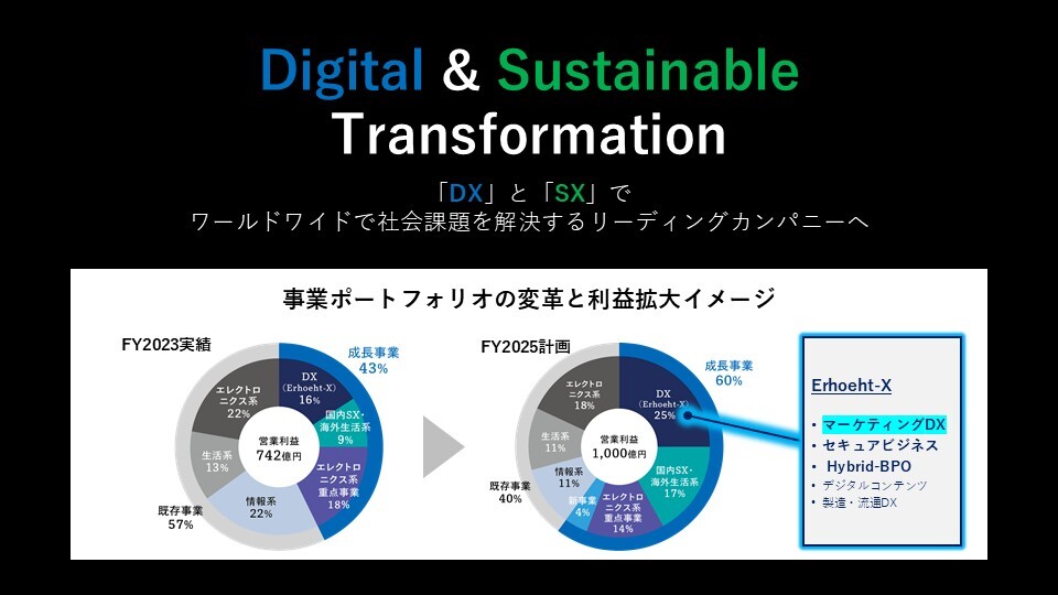 秋月:現在、我々は「DX(デジタルトランスフォーメーション)」と「SX(サステナビリティトランスフォーメーション)」という大きなメッセージを掲げ、社会課題を解決するリーディングカンパニーになることを目指しています。現中期経営計画でも事業ポートフォリオの変革、つまり収益構造をDXやSXといった成長事業へ大きくシフトさせようとしています。本日お話しするのは、このDXの文脈の中、特に「マーケティングDX」という事業領域における営業変革についてです。
