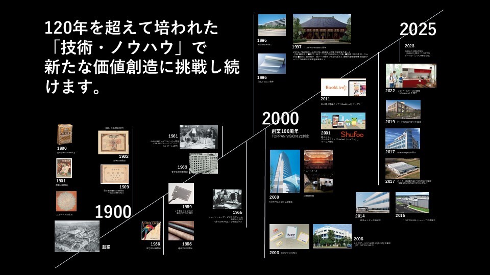 我々のビジネスは今年で125年目を迎えます。創業は1900年で、大蔵省の紙幣寮にいたメンバーが、当時の最新技術であったエルヘート凸版法という印刷技術を持ち出して起業したのが始まりです。根本的にはベンチャースピリッツのある企業だと考えています。そこから、強みであるテクノロジーを多角化し、現在に至ります。