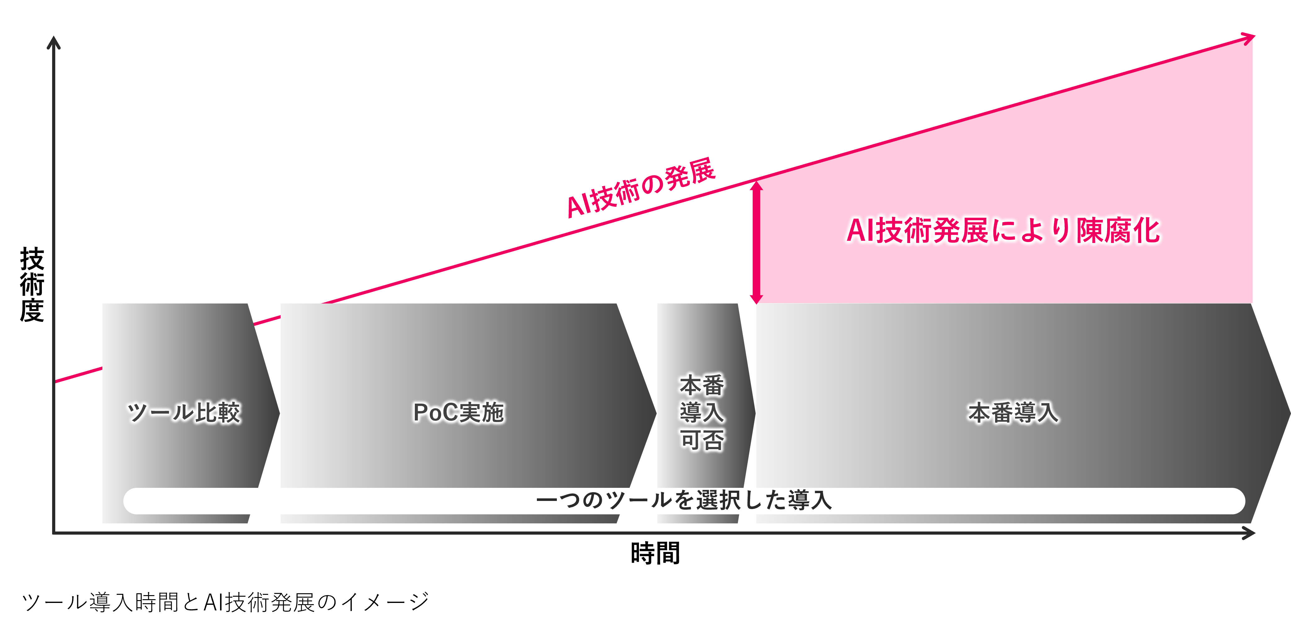 畠山:AI導入にあたっては、過去到来したDXブームの反省点を活かすことが大事だと考えています。DXブームの反省点としては3つのキーワードがあります。導入までの期間が長い上なかなか成果に結びつかない「PoC疲れ」、変革をリードできる専門人財が不足している「DX推