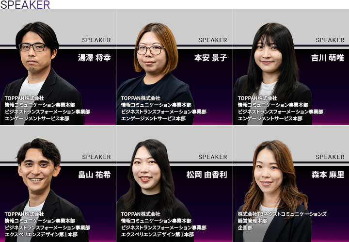 上段(左から) TOPPAN株式会社 湯澤 将幸 |ビジネストランスフォーメーション事業部 エンゲージメントサービス本部 本安 景子 |ビジネストランスフォーメーション事業部 エンゲージメントサービス本部 吉川 萌唯 |ビジネストランスフォーメーション事業部 エンゲージメントサービス本部 下段(左から) TOPPAN株式会社 畠山 祐希 |ビジネストランスフォーメーション事業部 エクスペリエンスデザイン第一本部 松岡 由香利|ビジネストランスフォーメーション事業部 エクスペリエンスデザイン第一本部 株式会社TBネクストコミュニケーションズ 森本 麻里 |経営管理本部 企画部 ※所属企業名・部署名は2025年8月時点 |