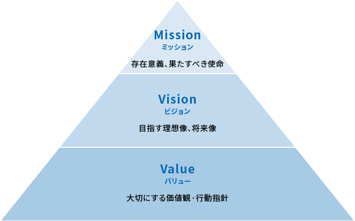 MVVとは、Mission(ミッション)、Vision(ビジョン)、Value(バリュー)のことを指します。