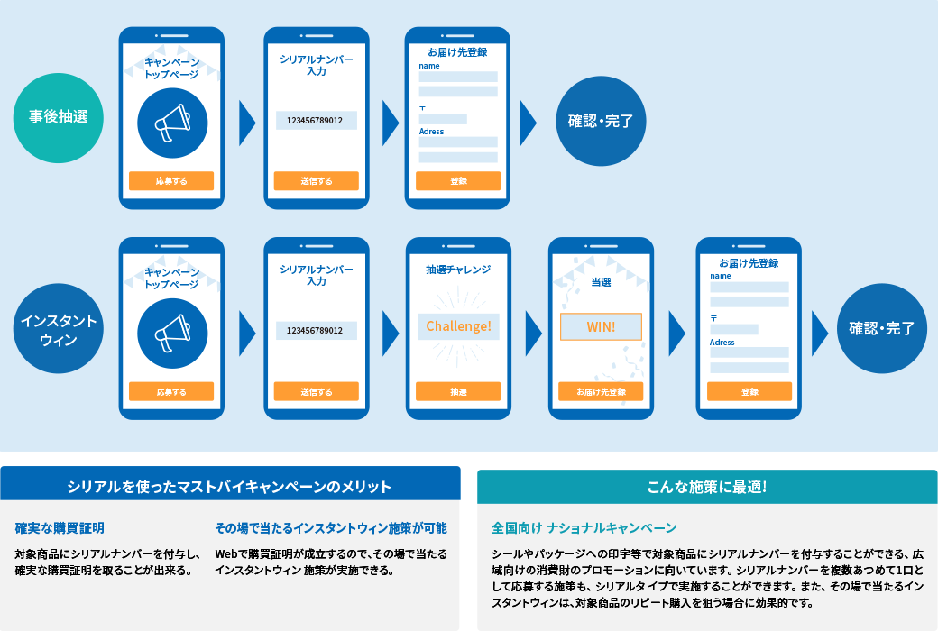インスタントウィンキャンペーン インスタントウィンキャンペーンでは、応募後にすぐ当選結果が表示されます。シリアルナンバーやユニークQRを活用することで、当選者に対する喜びやワクワクなどのポジティブな体験を即時的に提供できます。