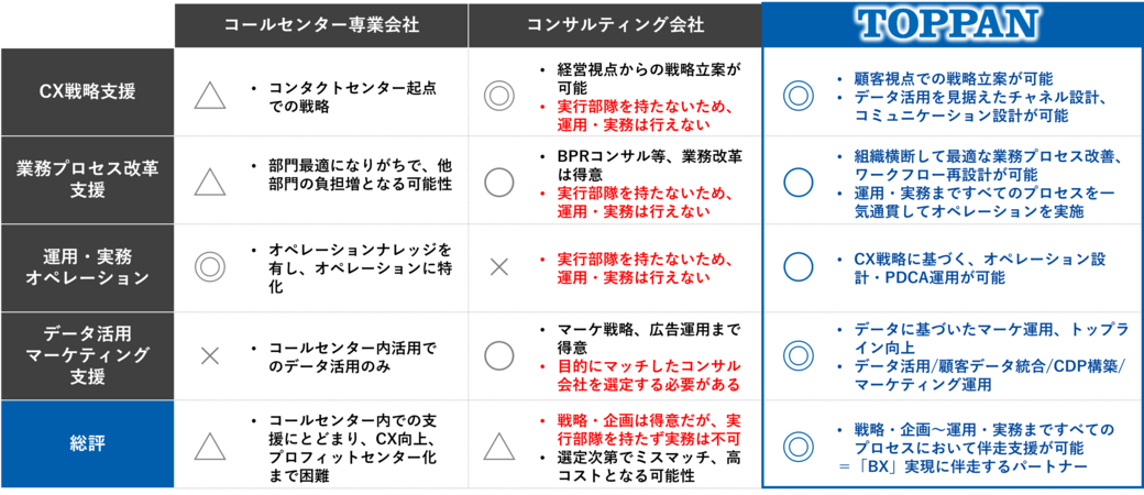 - CX戦略に基づくオペレーション設計及びプロフィット化に向けたデータ活用までトータルでご支援 TOPPANは、コンタクトセンター専業会社やコンサルティング会社とは異なり、戦略・企画から、組織横断的な運用設計・実務、そしてデータ活用によるマーケティング貢献まで、すべてのプロセスを一気通貫で伴走支援します。