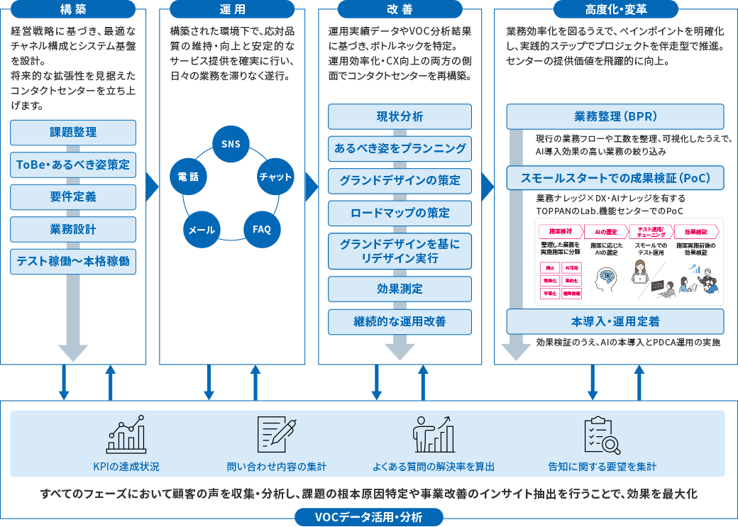 TOPPANは、コンタクトセンターを成功に導くために必要な全フェーズを網羅的に支援します。