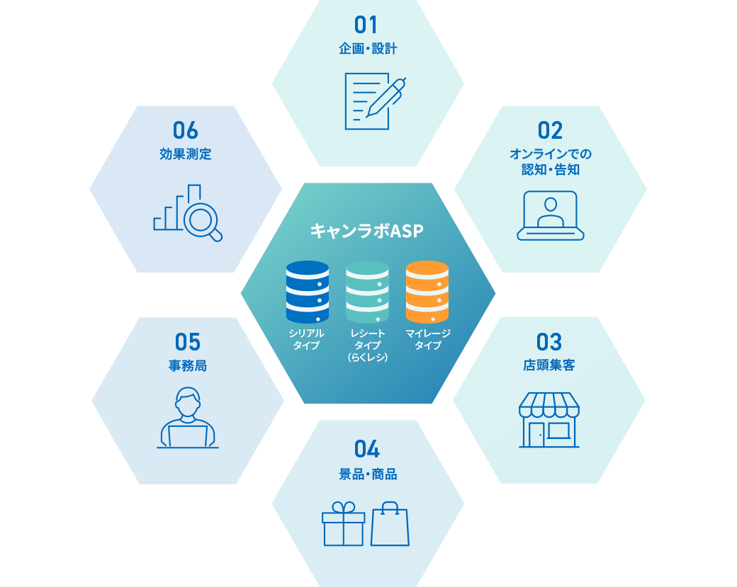 応募・抽選管理などが可能な「キャンラボ ASP レシートタイプ」のシステム利用はもちろん、キャンペーン運営にかかる企画や効果検証、事務局対応などの業務を包括的にサポートすることで、「デジタルキャンペーンが運営できる体制」を構築することが大きな特徴です。
