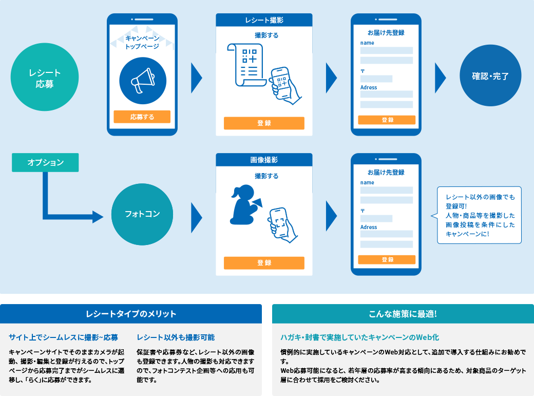 アプリのダウンロードは不要。スマートフォンで撮影し、必要な情報をフォームに入力するだけでキャンペーンに参加できます。