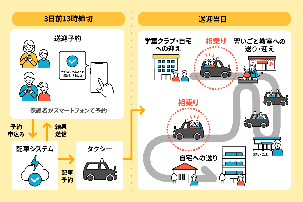 TOPPANが提供する「こどもび®」は、タクシー相乗り型の子ども送迎サービスで、学童・習い事・自宅間の送迎を子どもだけ(付き添い可)で行います。