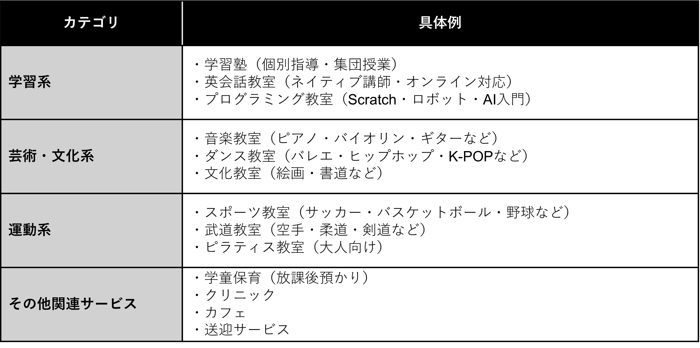 習い事複合施設は単なるサービスの集合体ではなく、学童保育や習い事、地域交流スペースなどを一体化することで、収益性と地域貢献を両立させる新しい事業形態です。