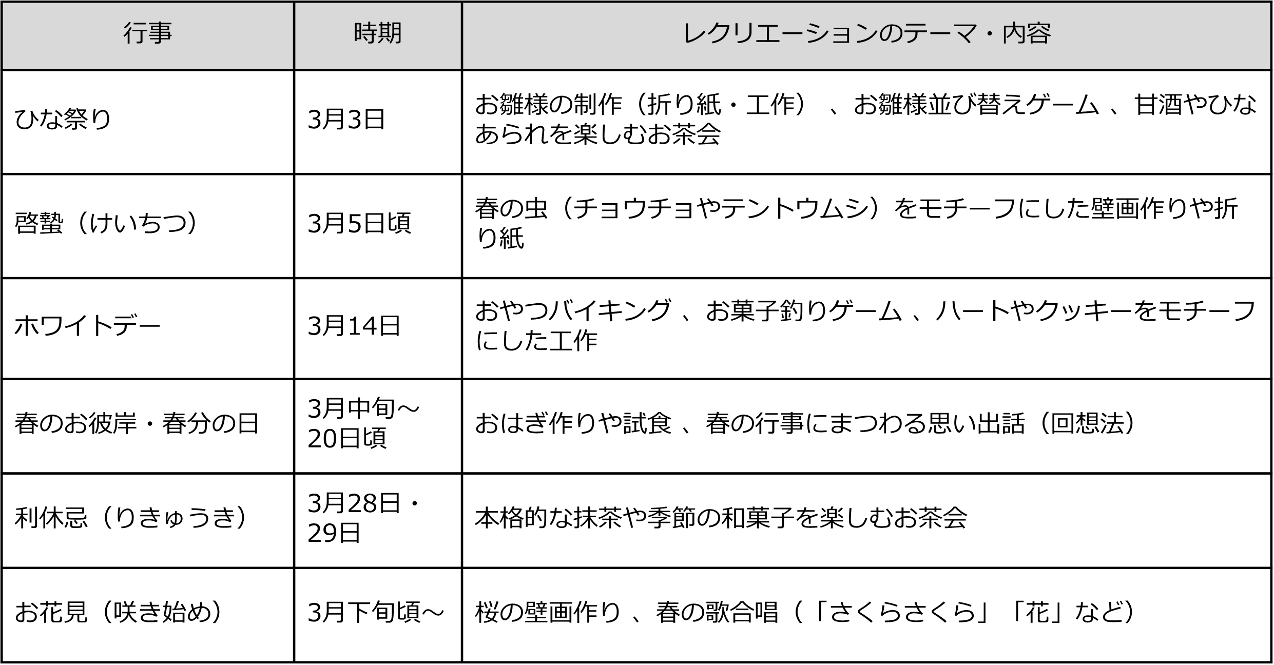 ひな祭りやホワイトデー、春分の日(お彼岸)など、3月ならではの主要な行事とレクリエーションのテーマを表にまとめました。