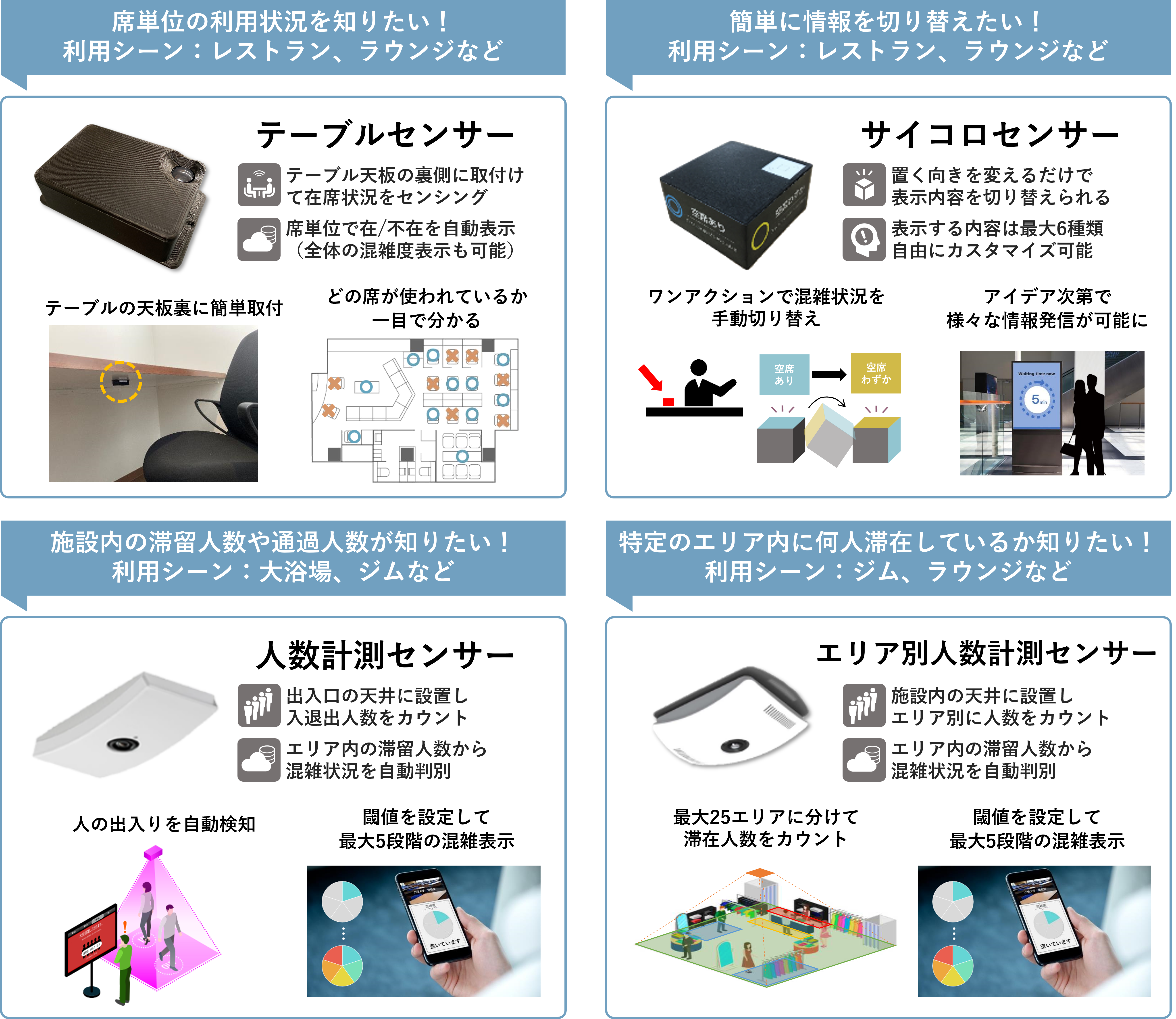 離れた場所の混雑状況がどこでも確認できるため、利用者の不安解消、スタッフの業務負荷軽減に貢献します。