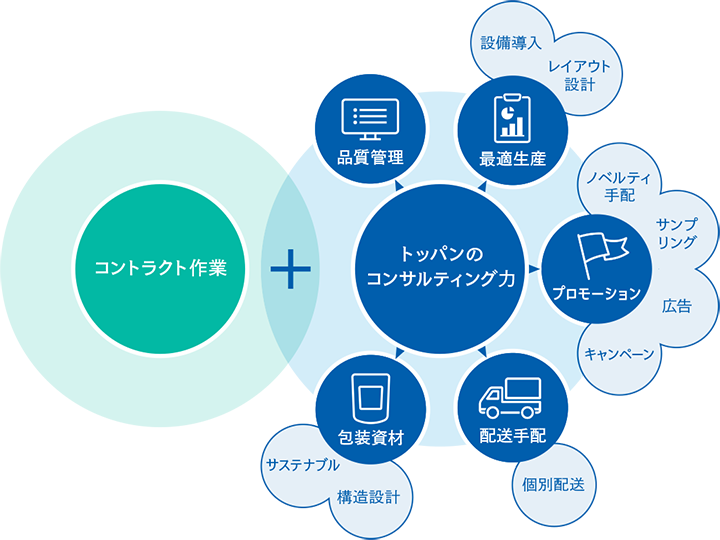 TOPPANでは専門スタッフが顧客の要望をヒアリングし、最適な拠点や作業工程を設計する体制を整えています。食品の充填包装について一気通貫での受託が可能で、パッケージデザインの提案から環境対応まで幅広くサポートしています。