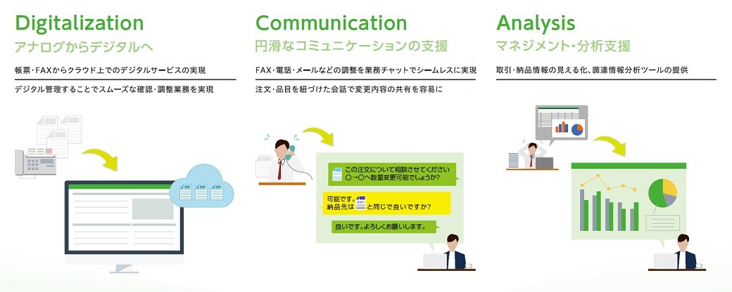 受発注業務における具体的な改善策として、TOPPANのクラウド型受発注システム「SDNECT®」があります。このシステムは、電話やFAX、メールなどを使って行われる発注・調達業務の効率化を実現し、企業間取引で発生していた注文と同時に行われるFAXや電話での細かい調整や例外処理対応をデジタル化します。