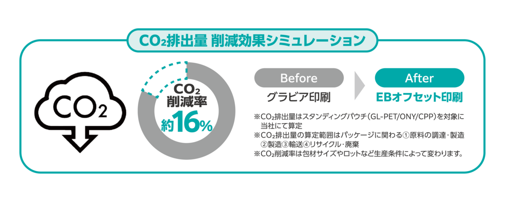 グラビア印刷のように印刷工程で有機溶剤を使用する場合は、それを乾燥させる必要があります。また、その有機溶剤を焼却する際にCO₂が排出されます。しかし、EBオフセット印刷はEB(Electron Beam)照射技術によりインキを瞬時に硬化させる乾燥ユニットを不要とした印刷方式のため、CO₂・VOCの排出量を削減することが可能です。