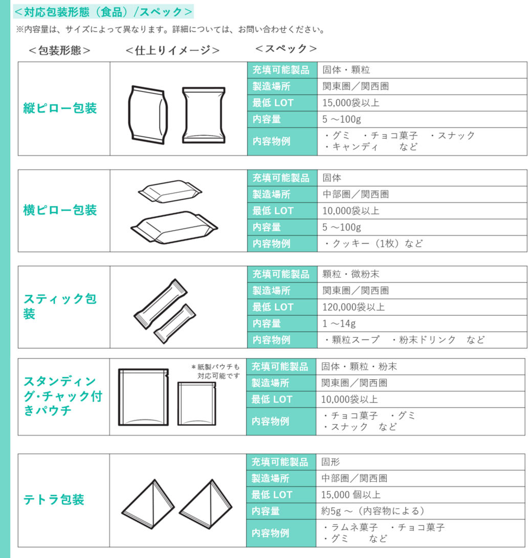 食品の一次充填にも対応しています。対応可能な品種については、下記「お問い合わせ」よりご相談ください。