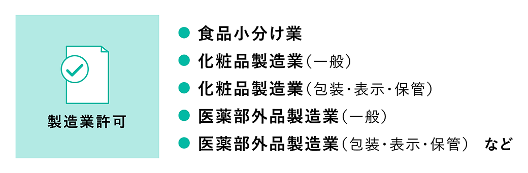 - 多様な取り扱い免許を保有する食品充填の作業拠点を確保 各種の取り扱い免許を保有し、充填作業を行える拠点を確保しております。