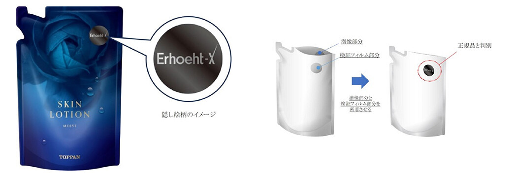 - 一般消費者でも視覚的に真贋判定が可能 パウチに印刷されている2つの模様を合わせて、隠し絵柄が出現した場合は正規品、隠し絵柄が出現しない場合は偽物であると明確に判断をすることができます。検証のための器具を必要としないため、一般消費者でも容易に真贋判定が可能です。