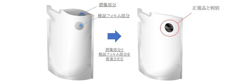パウチに印刷されている2つの模様を合わせて、隠し絵柄が出現した場合は正規品、隠し絵柄が出現しない場合は偽物であると明確に判断をすることができます。検証のための器具を必要としないため、一般消費者でも容易に真贋判定が可能です。