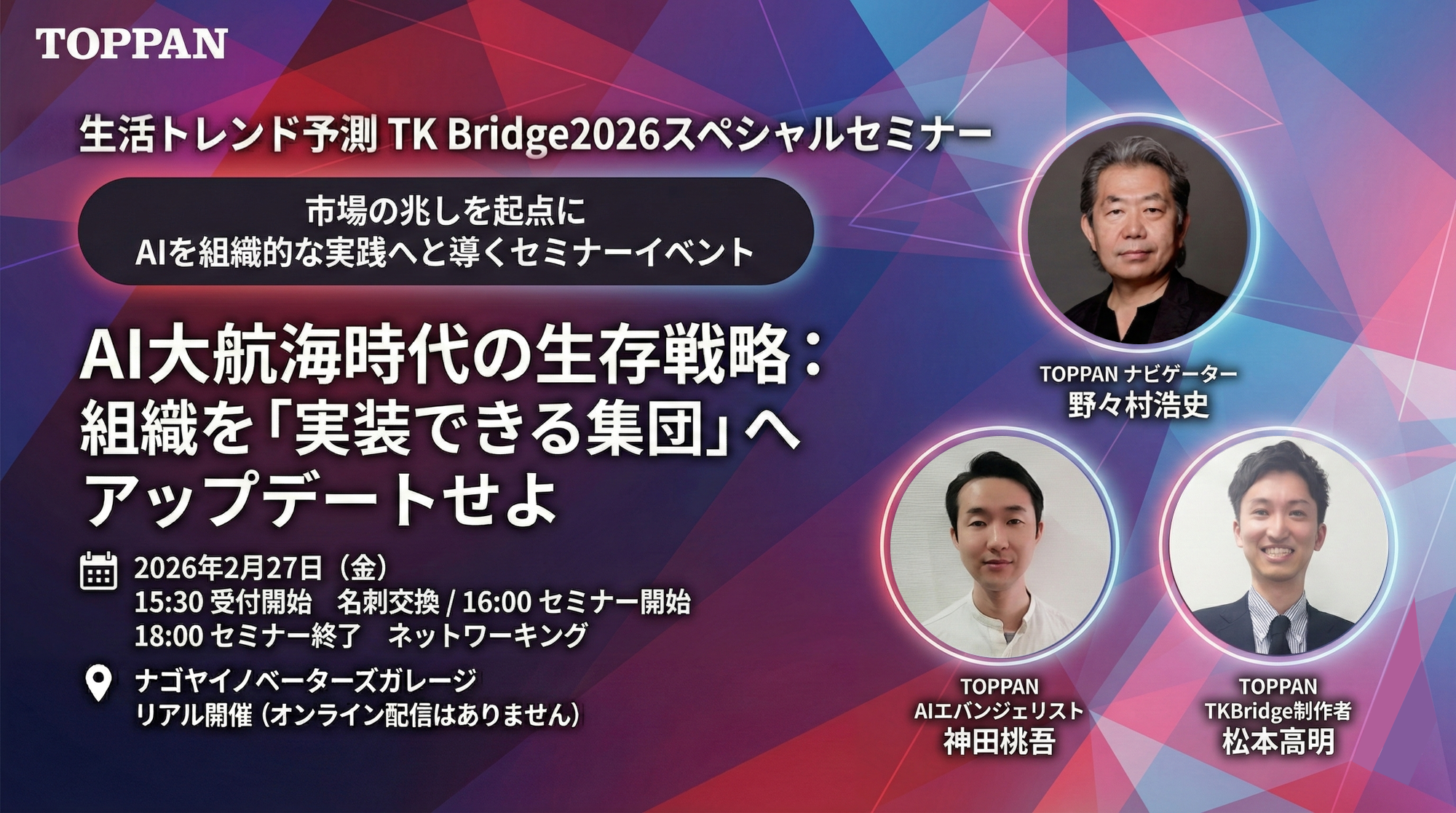 本セミナーでは、生活トレンド予測『TKBridge 2026』を起点に、AIが最適解や意思決定を提示する時代において、組織が何をAIに委ね、何を人間が担い続けるべきかという判断軸を整理します。多くの企業でAI活用が「導入」で止まってしまう背景をひも解きながら、AIを単なる効率化や判断の代行者にしないための向き合い方と設計の考え方を解説します。AIと協働しつつも組織として意思と価値観を持ち続け、「実装できる集団」へとアップデートしていくための実践的な視点を提供します。