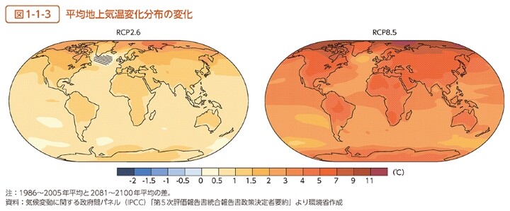 しかし、温室効果ガスが増えすぎると、地球の温度が上昇し、温暖化と呼ばれる状態になります。1986〜2005年の地上気温と2081〜2100年平均の差を見ると、今後温暖化がより一層進むことは歴然です。