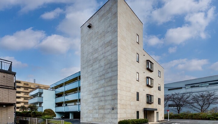 こちらは、マンションの外壁に石目調を採用した事例です。まるで天然石のような仕上がりですが、こちらは様々な下地の上に施工できる壁面シート材「クラスアートストーン」を使用しています。