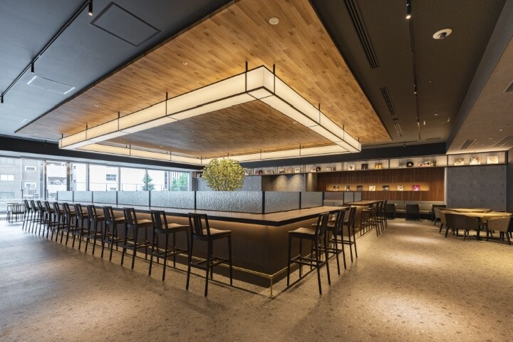 こちらはダークな天井の一部に明るい木目の板張り天井を採用した事例です。シンボリックな照明から放たれる柔らかい光とマッチし、落ち着いた印象に仕上がりました。