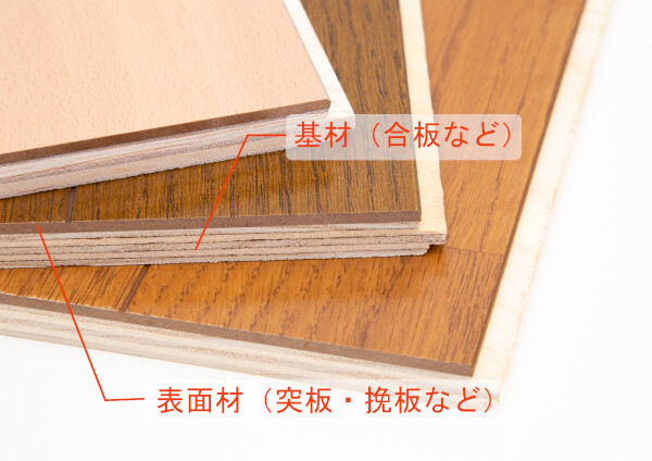 ・挽板化粧板:無垢材を2〜3mmの薄い板状にスライスした素材である挽板を表面材とする化粧板