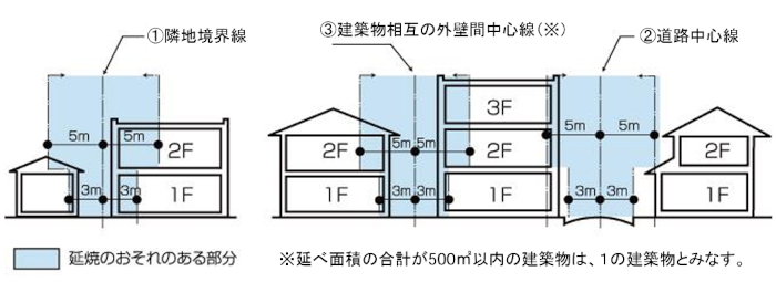 ※延焼のおそれのある部分:隣地境界線・道路中心線・同一敷地内に建つ2以上の建築物相互の外壁間中心線から、1階は3m以内、2階以上は5m以内にある建築部分