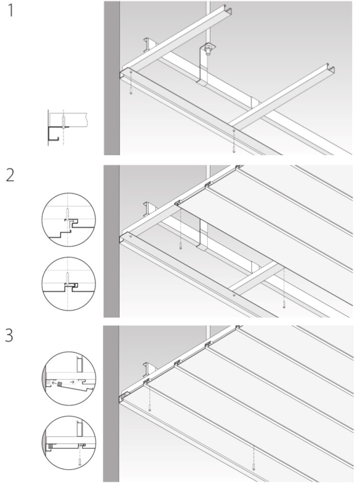 スパンドレルを天井や軒天など水平方向に施工する場合、通常はパネルの貼り方向と直行するように野縁を組みます。一般的には、軽量鉄骨(LGS)で下地をつくり、その上にスパンドレルを固定するイメージです。