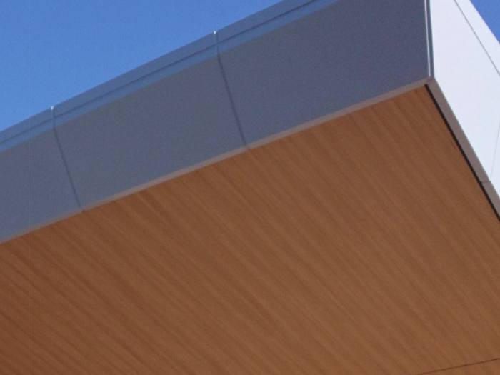 スパンドレルとは、金属製の外装材で、主に建物の外壁や軒天、天井材として用いられます。鋼板製やアルミ製があり、どれも耐火性に優れた不燃材料として、建築基準法及び施行令の防火規定を受ける部位にも施工可能な仕上げ材です。