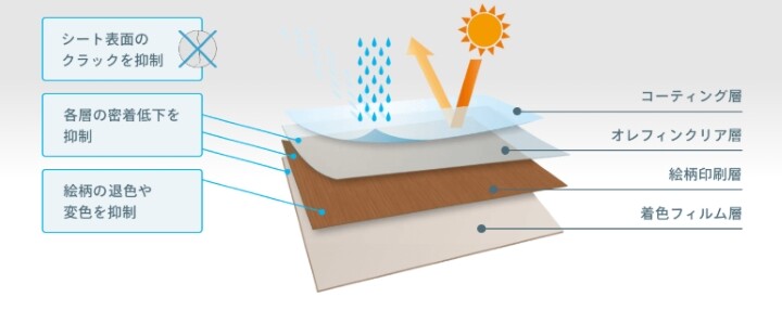 “TOPPAN”のスパンドレルは、耐候性が特に高い外装R仕様をお選びいただけます。表面の特殊コーティング層により、劣化の原因となるクラックや密着度低下を防ぎ、絵柄の退色・変色も抑えるため、長期間にわたり意匠性をキープできます。