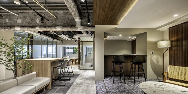 こちらは、鉄骨や躯体の表し(あらわし)と木目天井、シンプルやホワイトの天井を組み合わせた事例です。素材や色味が異なる天井をバランスよく組み合わせ、スタイリッシュなデザインにまとめました。