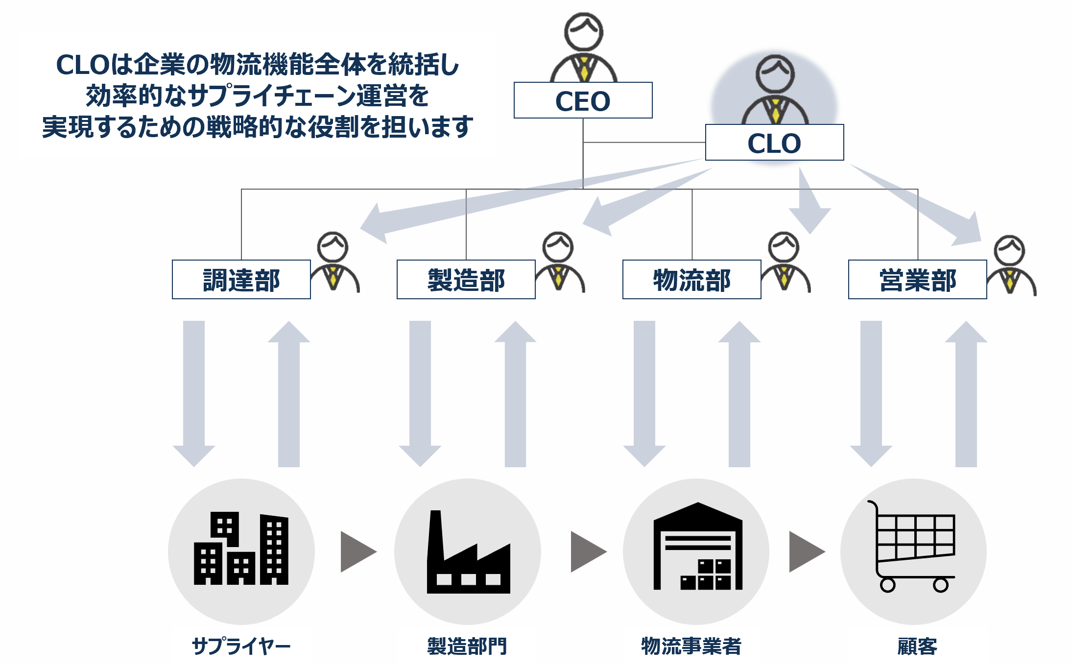 CLO(Chief Logistics Officer:物流統括管理者)は、経営視点から社内外を俯瞰し、部門横断的にサプライチェーンの全体最適を図る責任者です。役員等、事業運営上の重要な決定に参画する経営幹部から選任される必要があります。