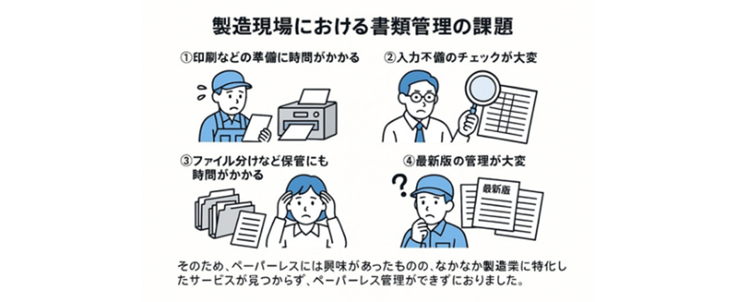 そのため、ペーパーレスには興味があったものの、なかなか製造業に特化したサービスが見つからず、ペーパーレス管理ができずにおりました。