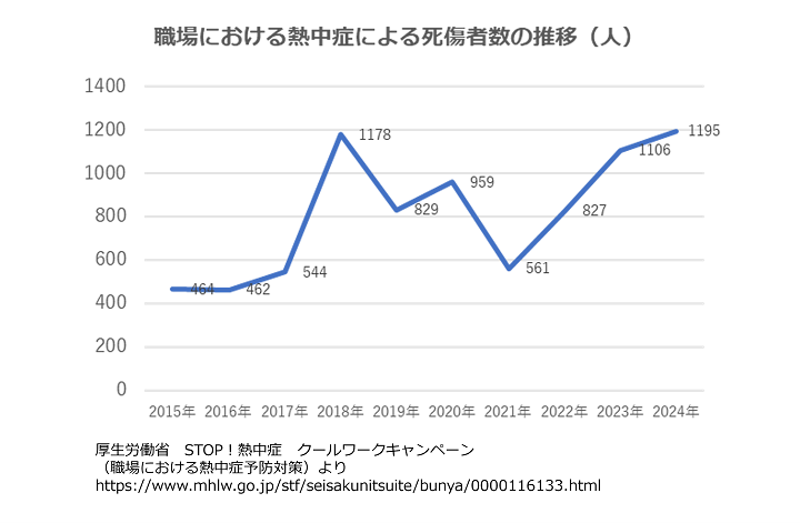その背景には、気候変動を原因とした例年の猛暑により、熱中症リスクが拡大していること、特に高温多湿な工場エリアや倉庫作業、屋外作業で労働災害が増加しており、職場における熱中症による死傷者数の推移を見ても2021年の561人から2024年には1,195人 と3年間でほぼ2倍にも増加している点などが挙げられます。医療費や休業補償などのコストも深刻化しています。