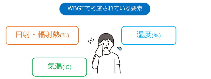 WBGT は(Wet Bulb Globe Temperature)の略称で、日本語では「熱中症指数」や「暑さ指数」と訳される、気温、湿度、輻射熱(直射日光や熱源からの放射)を総合的に考慮した熱中症リスク指数です。一般的な「気温」だけでなく、湿度や輻射熱(黒球温度)の影響を踏まえて評価を行うのが特徴です。