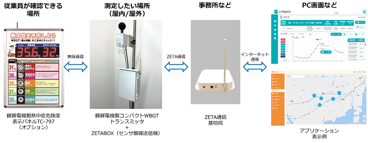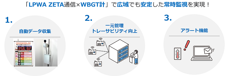 本ソリューションの特徴は、「LPWA ZETA通信×WBGT計」で広域でも安定した常時監視を実現する点です。