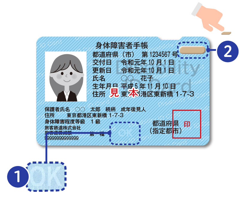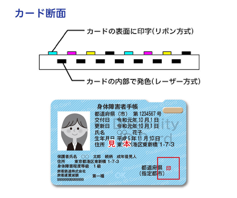 | ●セキュリティカード かすれに強いレーザー印字式カードに複数の印刷加工技術を組み合わせることで、より高度な偽造防止効果を持たせたカードです。カード様式障害者手帳、健康保険証や資格証などに最適です。 ❶ ヒドンワード®︎ 独自配合のインクを使用し、コピー機などでスキャニングすると文字が浮かび上がります。インクの使用は微量なため費用の負担もわずかです。 ❷ タクタイル加工 レーザー光線でカード表面を凸状にする加工です。触れることでカードの判別を付けることができるユニバーサルデザインです。エンボス加工と違い、デザインに柔軟性があることも特長です。 ※ この製品は特許出願中の技術を使用しています。 |