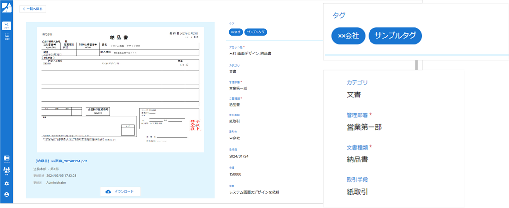 画像・動画・PDF・Office系ファイル等の業務で用いたデータを、管理項目とセットで一元管理することができます。