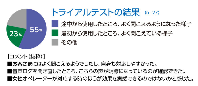 その結果、個人差はあったものの「声を張り上げる頻度が減った」「お客さまから聞き返されることが減った」といった感想が多く集まり、なによりお客さま、オペレーター双方のストレスの軽減が傍目にも感じられました。