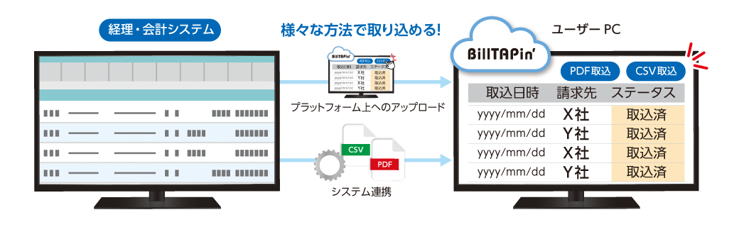 CSVとPDFで請求データの取込が可能で、取込方法はサービス上へのアップロード・システム連携の2種類があります。