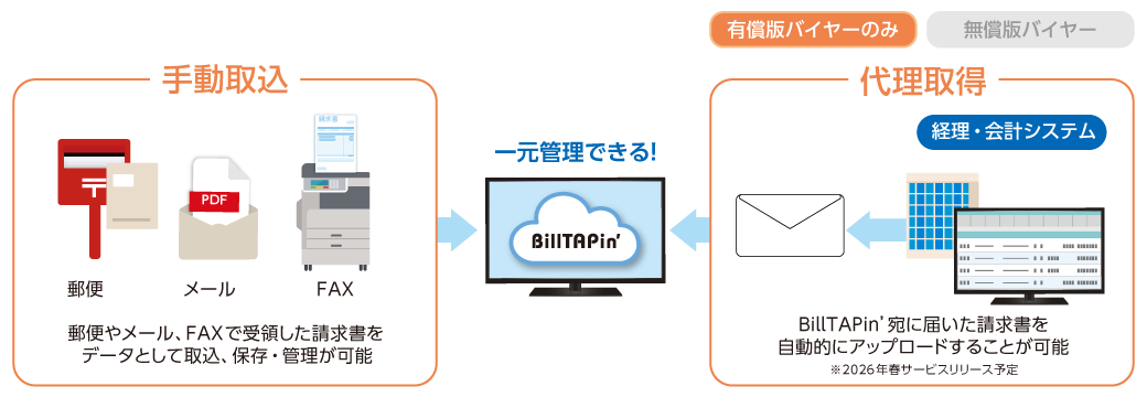 - 【for バイヤー】 多様な請求書取込手段と一元管理 BillTAPin’® for サプライヤーから届く請求書だけではなく、得意先から様々な方式で届く請求書を「BillTAPin’®」にアップロードできるため、すべての請求書を一元管理できます。