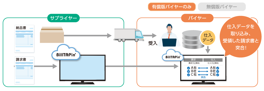 受発注システムの仕入れデータを「BillTAPin’®︎」 にアップロードすることで、受領した請求書と仕入れデータの突合作業をシステム化することが可能です。