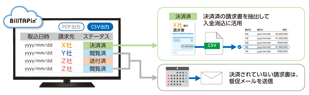 「BillTAPin’®」上に格納された請求データは、PDFまたはCSVで出力することが可能です。