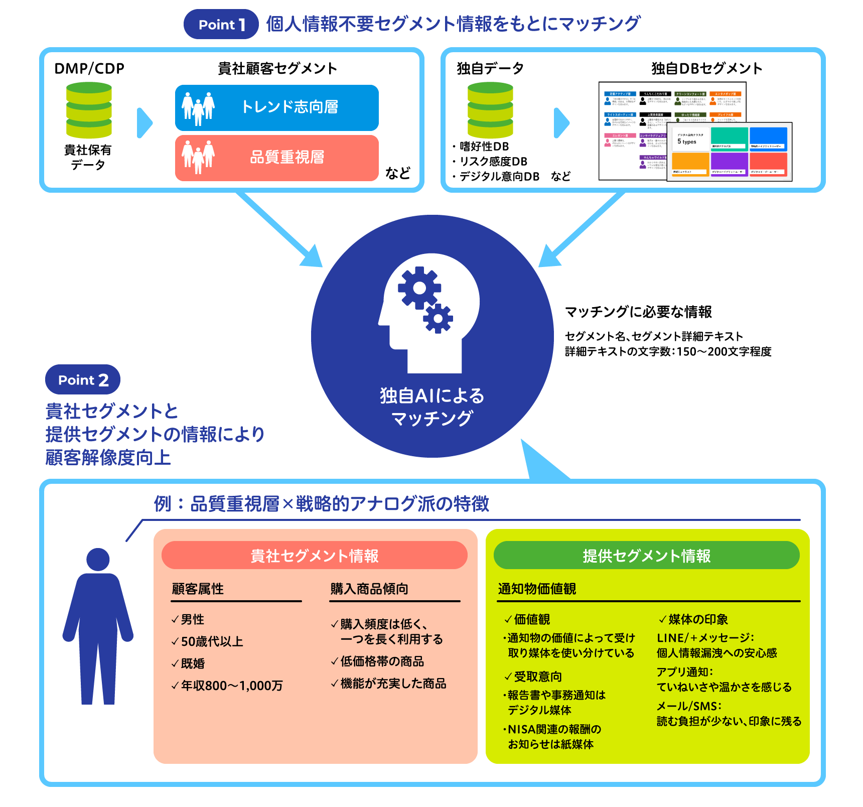 ペルソナマッチングソリューションでは、独自AIの活用により、個人情報や顧客データを用いること無く企業の顧客セグメントにTOPPANエッジ独自のセグメントをひもづけ、さまざまな施策に活用できるよう顧客情報をアップグレードします。