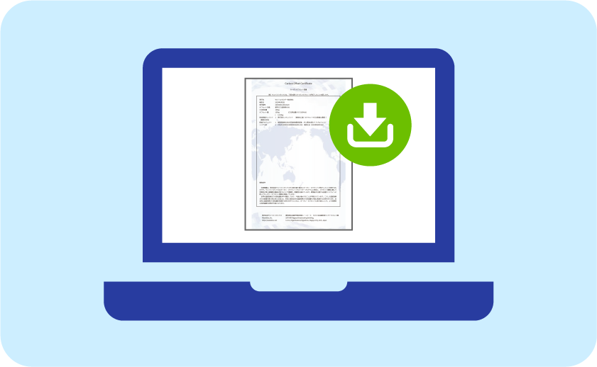| 支援したいカーボンクレジットを選択し、オフセットしたい数量を入力します。キログラム単位の小口から購入できるため、イベント単位や製品単位など、予算や用途に合わせて無駄なく活用できます。 | カートに入れた内容を確認し、そのままWeb上で申請・購入手続きを行います。従来のような紙の申請書への記入や郵送などの手間が無いため、スムーズに対応可能です。 | オフセット手続き完了後、すぐにマイページから「オフセット証書」のPDFが発行・ダウンロードできます。入手までの待ち時間が無いため、統合報告書への掲載やプレスリリースなど、対外的なPR活動へスピーディーに展開できます。 |