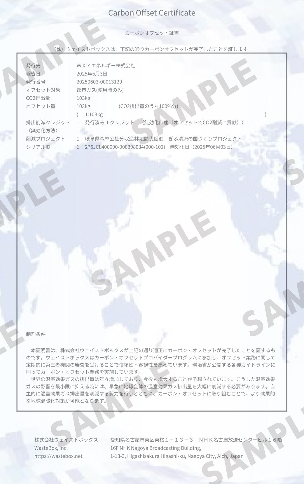 カーボン・オフセットとは 市民、企業、NPO/NGO、自治体、政府などの社会の構成員が、自らの温室効果ガスの排出量を認識し、主体的にこれを削減する努力を行うとともに、削減が困難な部分の排出量について、他の場所で実現した温室効果ガスの排出削減・吸収量など(カーボンクレジット)を購入すること、または他の場所で排出削減・吸収を実現するプロジェクトや活動を実施することなどにより、その排出量の全部または一部を埋め合わせる取り組み。 オフセット枠とは カーボンクレジットを購入し在庫している株式会社ウェイストボックスが、「みんなのカーボンオフセット」システム上で販売するカーボン・オフセットの権利を指す。カーボンクレジットの償却、無効化は、ウェイストボックスが行うが、実質的な利用の権利をユーザーに譲渡する形で、エンドユーザーがカーボン・オフセットの取り組みを実行できる。 株式会社ウェイストボックスについて 株式会社ウェイストボックスは、15年以上にわたり気候変動を中心とした環境コンサルティングサービスを提供し、プライム上場企業250社以上へのコンサルティング実績を有しています。その実績が認められ、国際的な環境NGOであるCDPから国内で唯一「気候変動コンサルティング&SBT支援パートナー」の認定を受けています。(認定企業は世界で20社のみ) また、近年は自然由来のNbS(Nature-based Solutions)系のカーボンクレジット創出にも力を入れており、カーボンクレジットを活用したカーボン・オフセットの手続きや、カーボンクレジット創出から販売まで、トータルサポートが可能です。企業の環境負荷把握と情報開示を支援することで、環境と経済の両立を通して、循環型社会や脱炭素社会の構築に貢献することを目指しています。 株式会社ウェイストボックスのWebサイトへ |